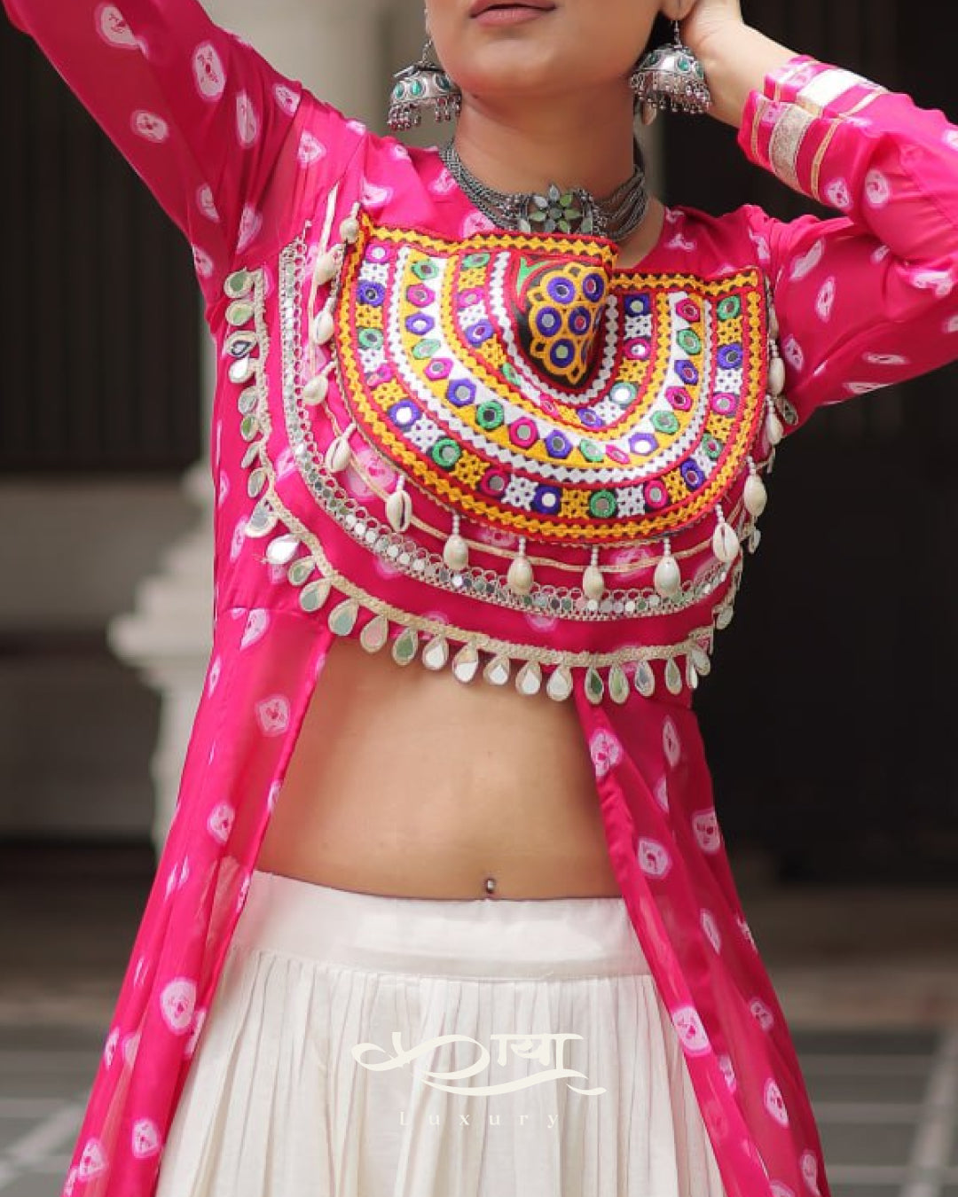 The lehenga is crafted in Kora Cotton with standard frill stitching, giving it a dramatic 12-meter flair β€” perfect for twirling through Garba and Dandiya nights. Fully stitched with a chain closure and dori latkan, it ensures a secure yet flexible fit. The soft cotton inner lining keeps it breathable and comfortable for long festive hours.